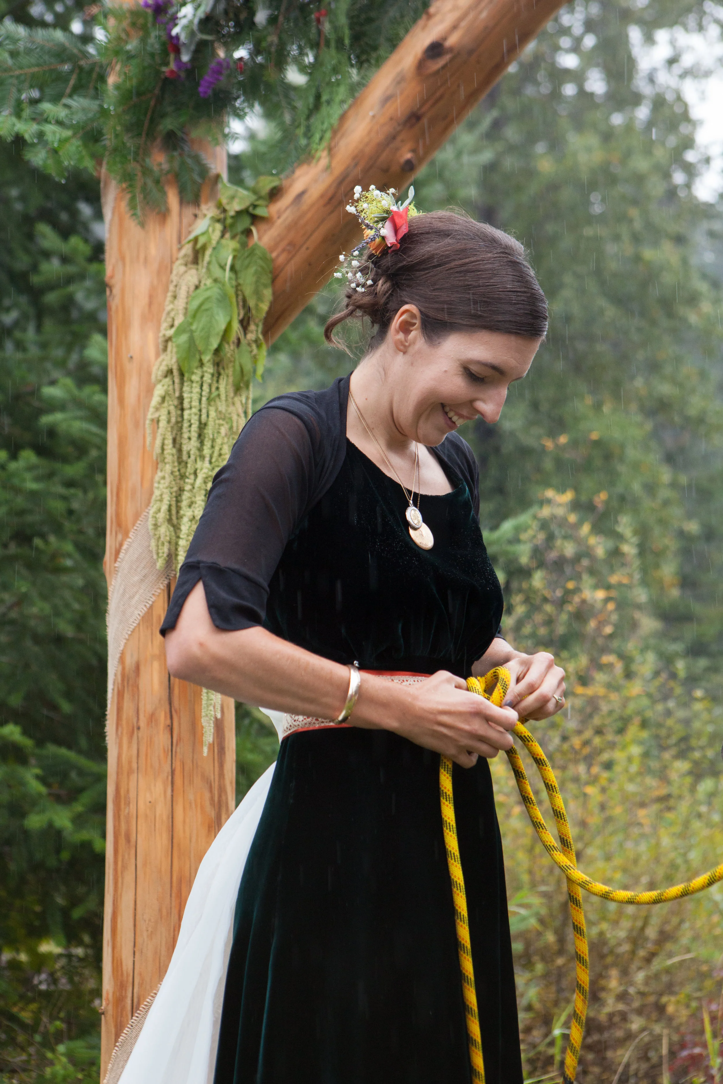 In truly Pacific Northwest style, my friends Rachel and Jon embraced the rain on their wedding day and committed their vows in the fall precipitation. They tied a double fisherman's knot in piece of climbing rope, symbolizing the connection of their two live paths.