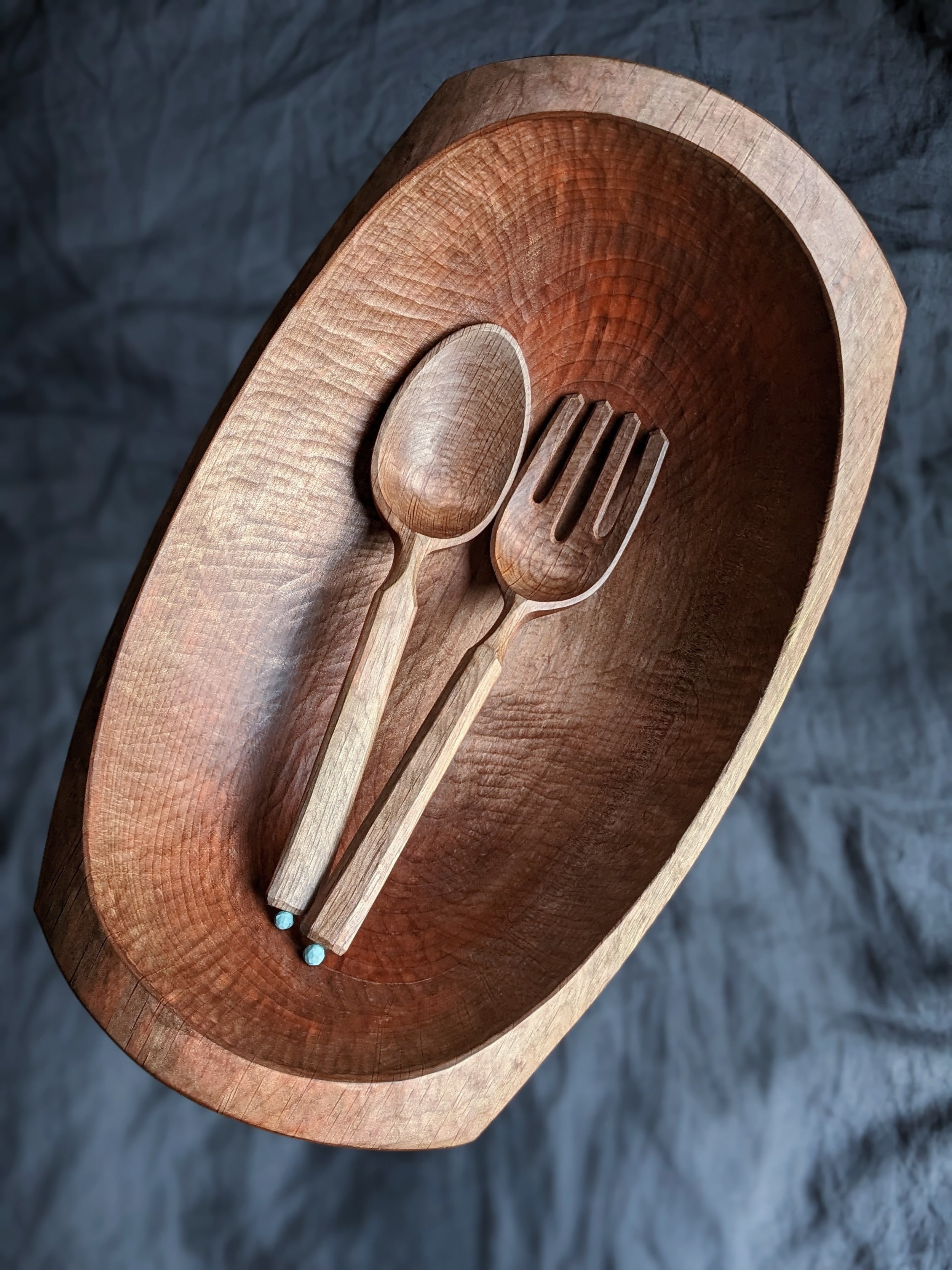 The bowl and serving spoons were carved over a five month period to allow the wood to be carved green (freshly harvested), slowly dried, finishing carving cuts, and cured with a food-safe oil. In all, ~50 hours of hand crafting went into the project starting from a bark-covered log to the finished piece.